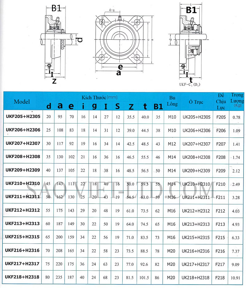 - Có các mã sản phẩm từ SUKF205 đến SUKF210, đáp ứng nhiều nhu cầu kích thước và tải trọng khác nhau.
