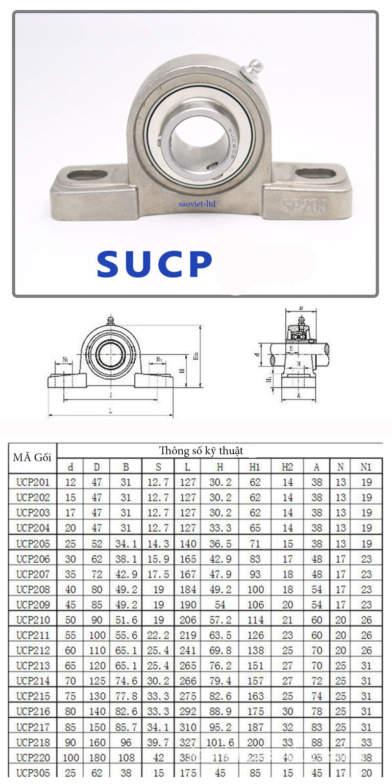 BẢNG THÔNG SỐ KỸ THUẬT GỐI ĐỠ INOX SUCP203, UCP204, UCP205, UCP206, UCP207, UCP208