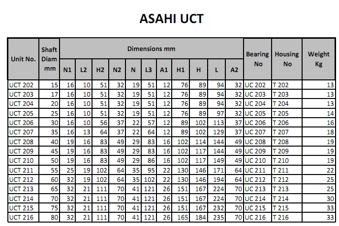 dùng vỏ gang T liền mảnh hình chữ T để đạt độ cứng tối đa, nhằm chống bị biến dạng hoặc bị mài mòn lúc lắp đặt cũng như khi vận hành,.Gối đỡ ASAHI UCTsử dụng vòng bi bên trong là UC thuộc dạng bi cầu 1 dãy bi.Bạc đạn này tương tự dòng bi 62xx và 63xx, có thể chịu tải hướng kính và một lượng tương đối tải hướng trục.Nhờ vành ngoài có dạng hình cầu bạc đạn UC có khả năng tự lựa.