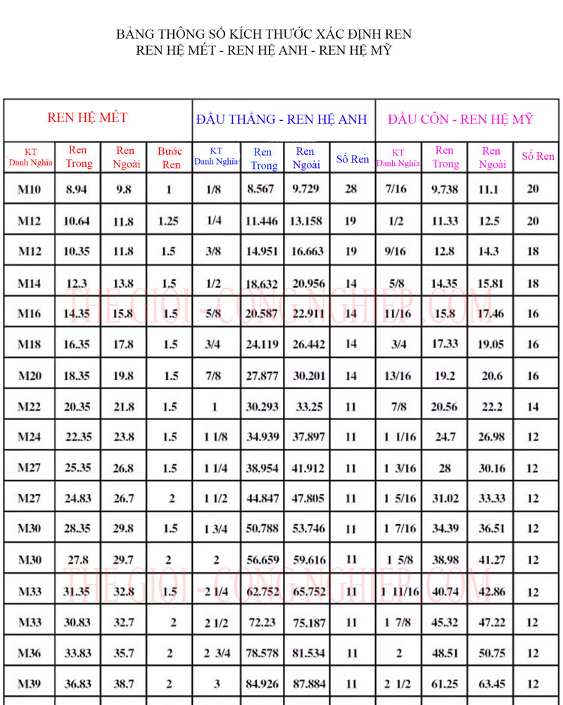 BẢNG THÔNG SỐ KỸ THUẬT ĐẦU KÉP CÔN REN NGOÀI