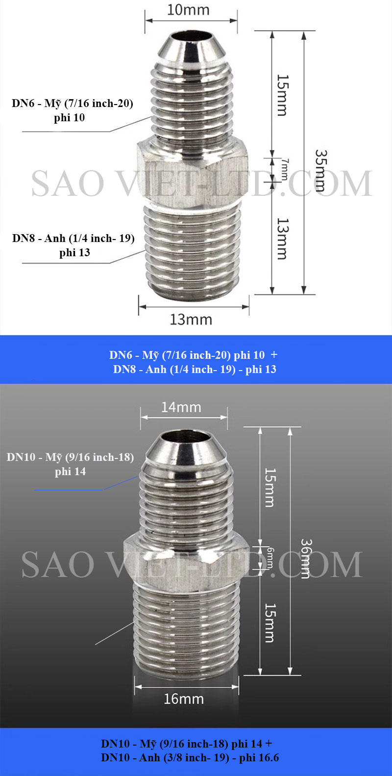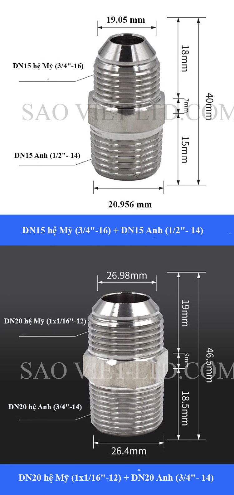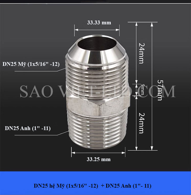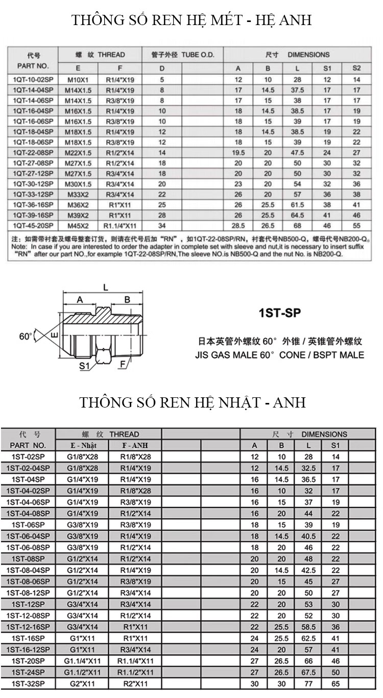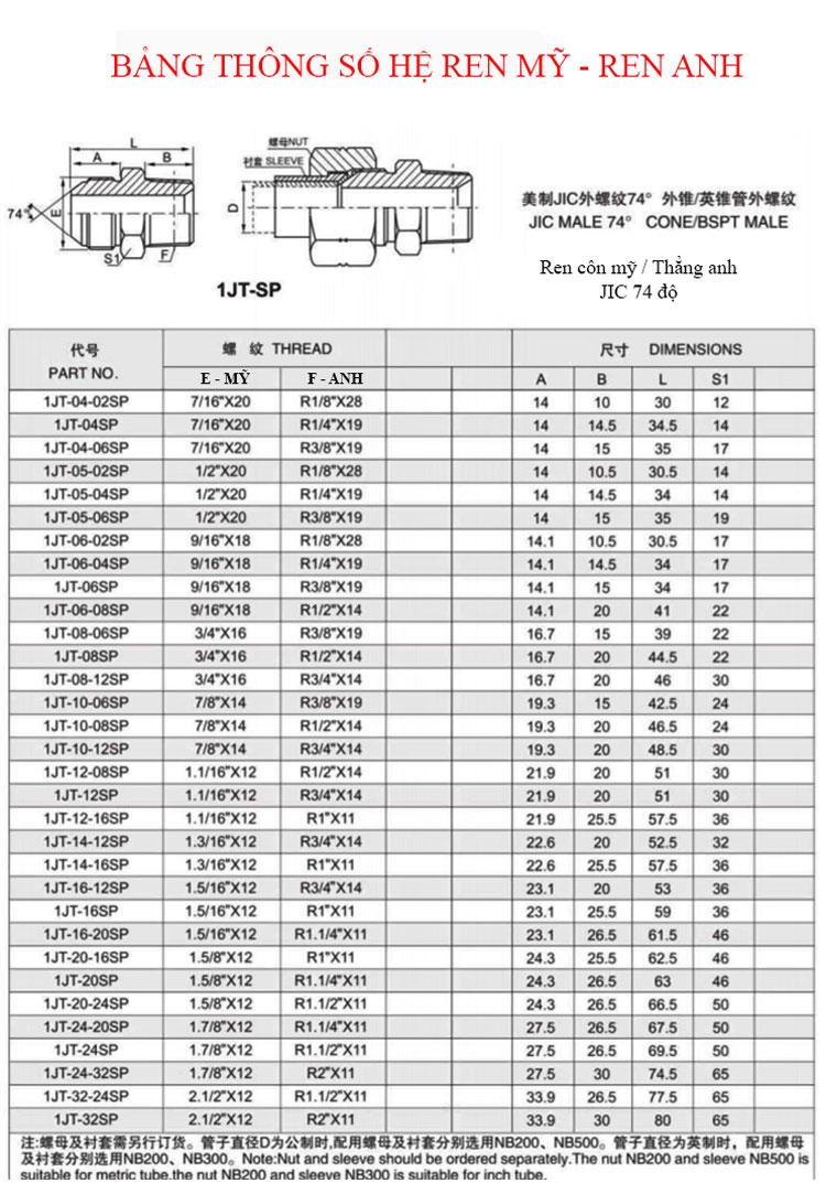 Kép côn ren ngoài: Đầu côn hệ ren Mỹ / Đầu thẳng hệ Anh