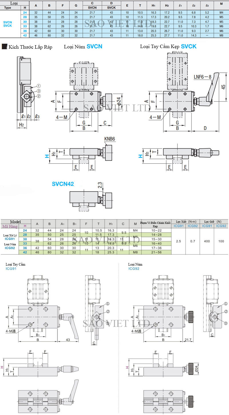Bảng Thông Số Và Bản Vẽ Kẹp Khóa Cố Định Đường Ray Thanh Trượt SVCK SVCN ICG91 ICG92
