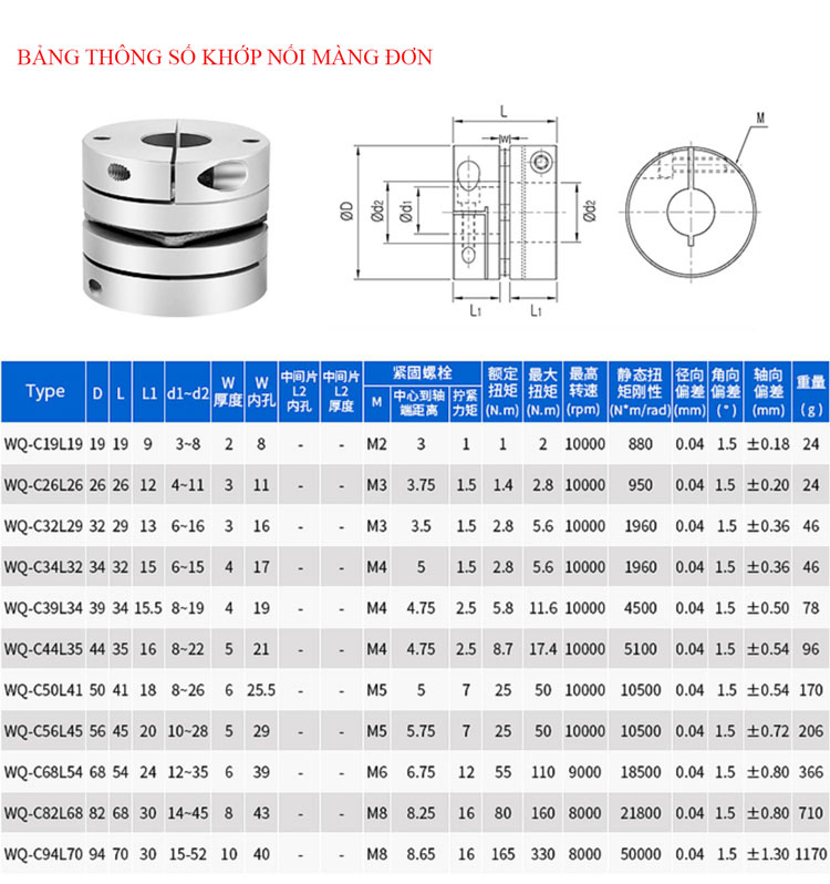 BẢNG THÔNG SỐ KHỚP NỐI MÀNG CHO ĐỘNG CƠ SECOVO