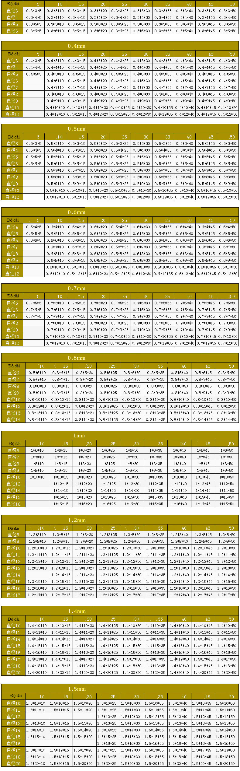 Kích Thước: 1/16 inch đến 1 1/2 inch