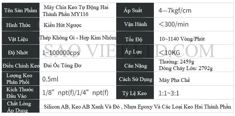Bảng Thông Số Kỹ Thuật Máy Chia Keo Tự Động Hai Thành Phần MY116