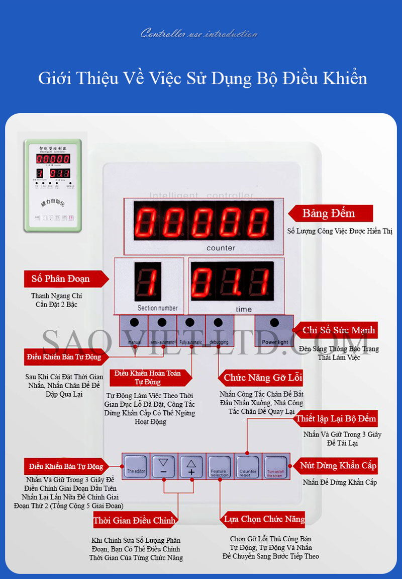 Bộ điều khiển: Công tắc chân hoặc tay, một số mẫu nâng cấp có bảng điều khiển điện tử.