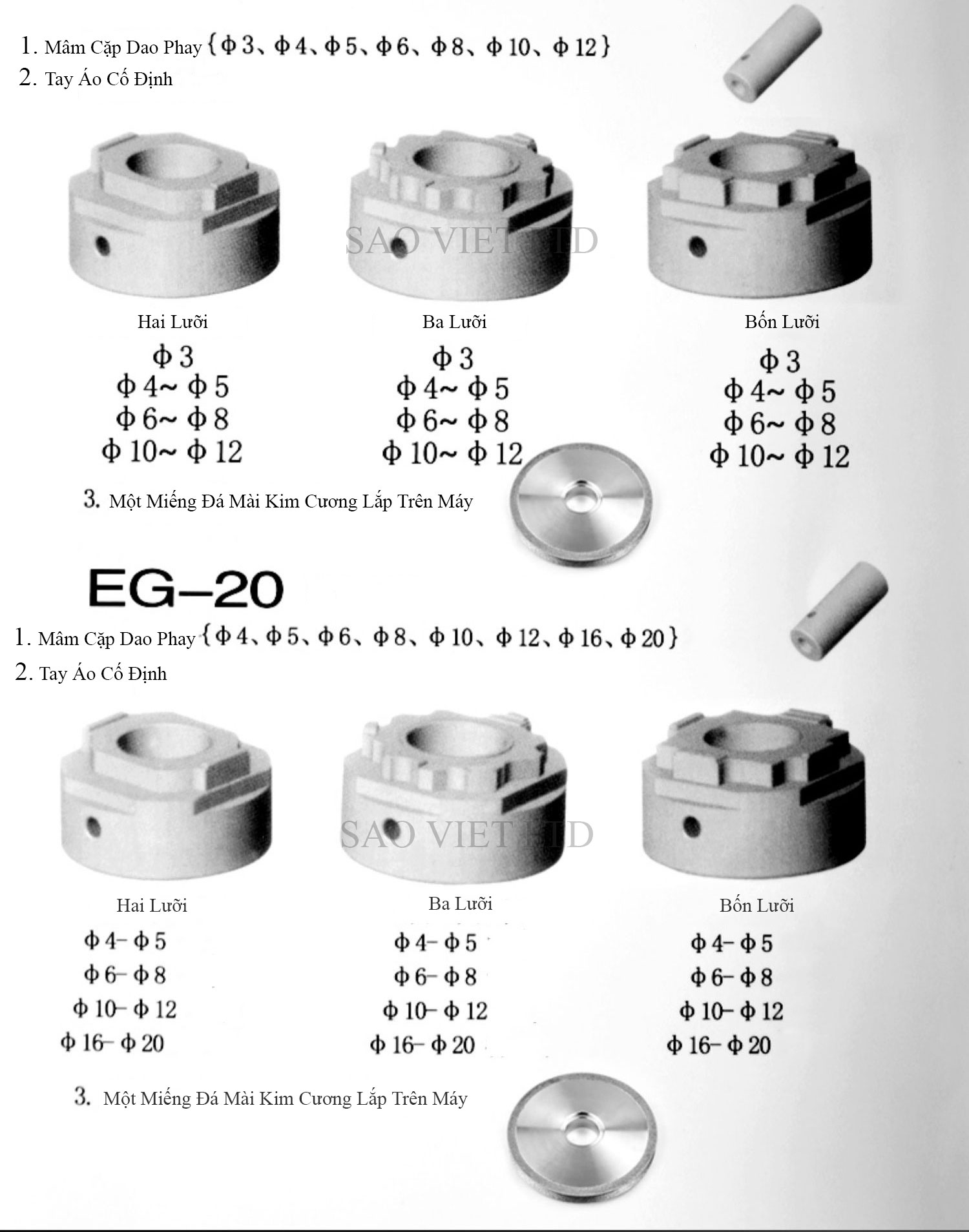| Đường kính dao phay mài được. | Ø4 - Ø16 | Ø4 - Ø20 |
