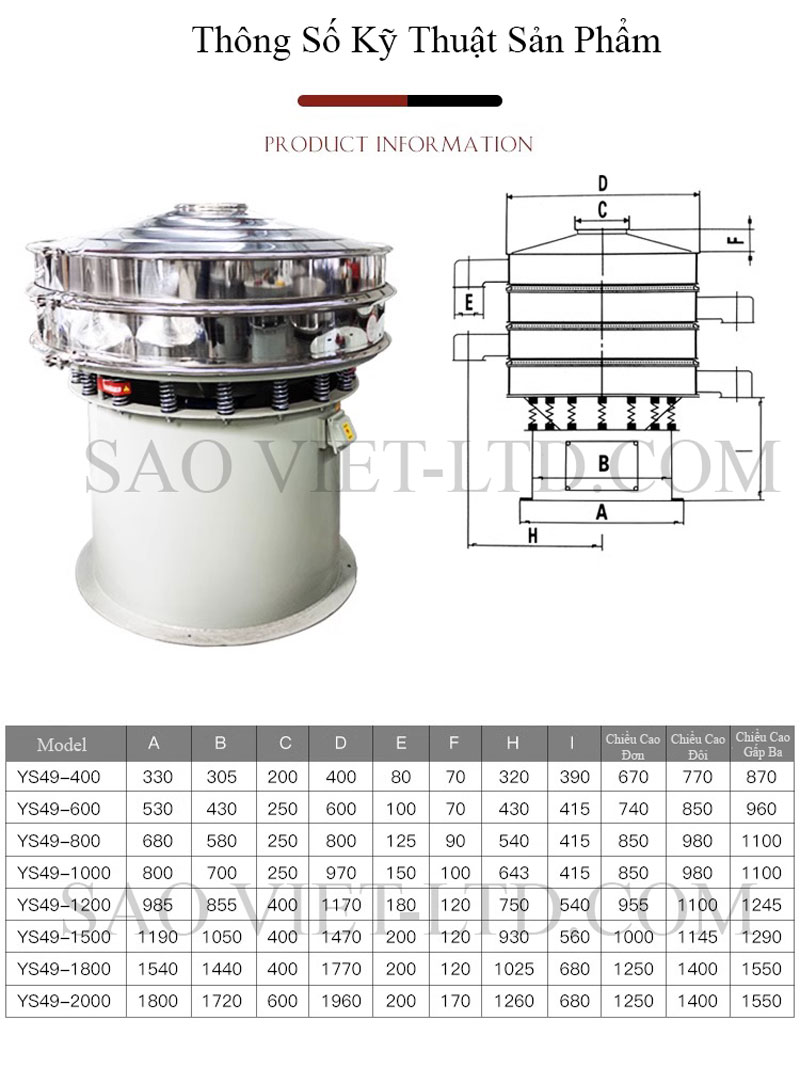 Bảng Thông Số Kỹ Thuật Máy Sàng Rung Thực Phẩm Nhiều Tầng