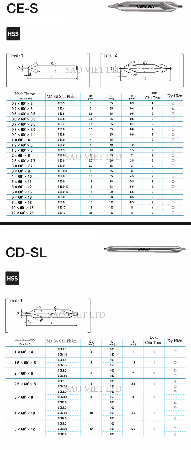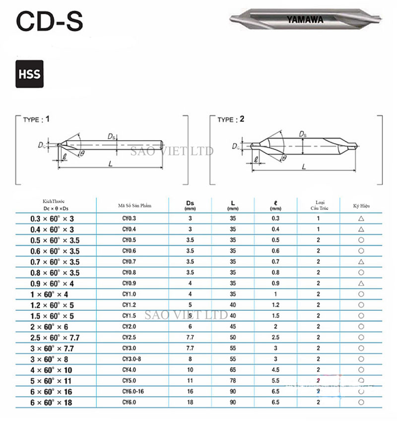 Bảng Thông Số Kỹ Thuật Mũi Khoan Tâm Yamawa