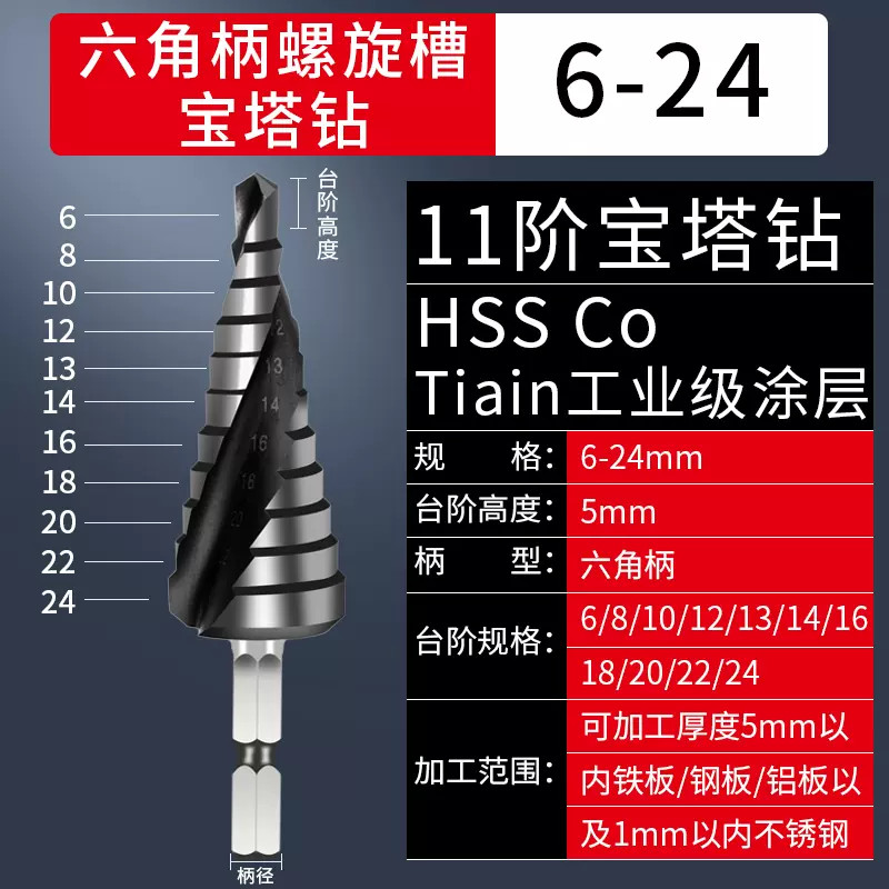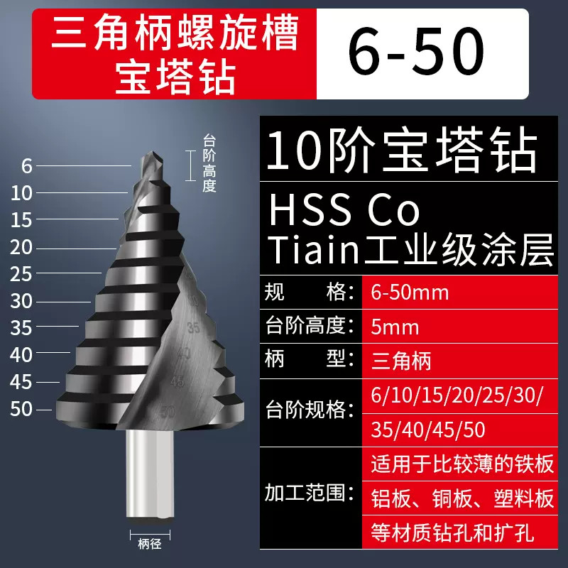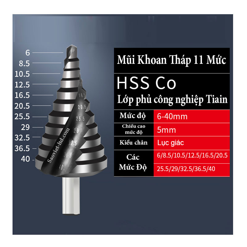 Mũi khoan tháp (Mũi khoan tầng) được làm bằng hợp kim inox 304 có độ cứng cực cao, được ứng dụng để khoan lên các vật liệu mà các loại mũi khoan thông thường không thể khoan được như inox, sắt, đồng... Với đường kính từ 4mm - 35mm bạn có thể khoan tạo lỗ, khoan doa, khoan phá theo các bước của mũi khoan từ 4mm, 5mm, 7mm, 10mm, 12mm, 15mm, 17mm, 20mm, 22mm, 25mm, 27mm, 30mm, 32mm, 35mm, 38mm, 40mm, 50mm