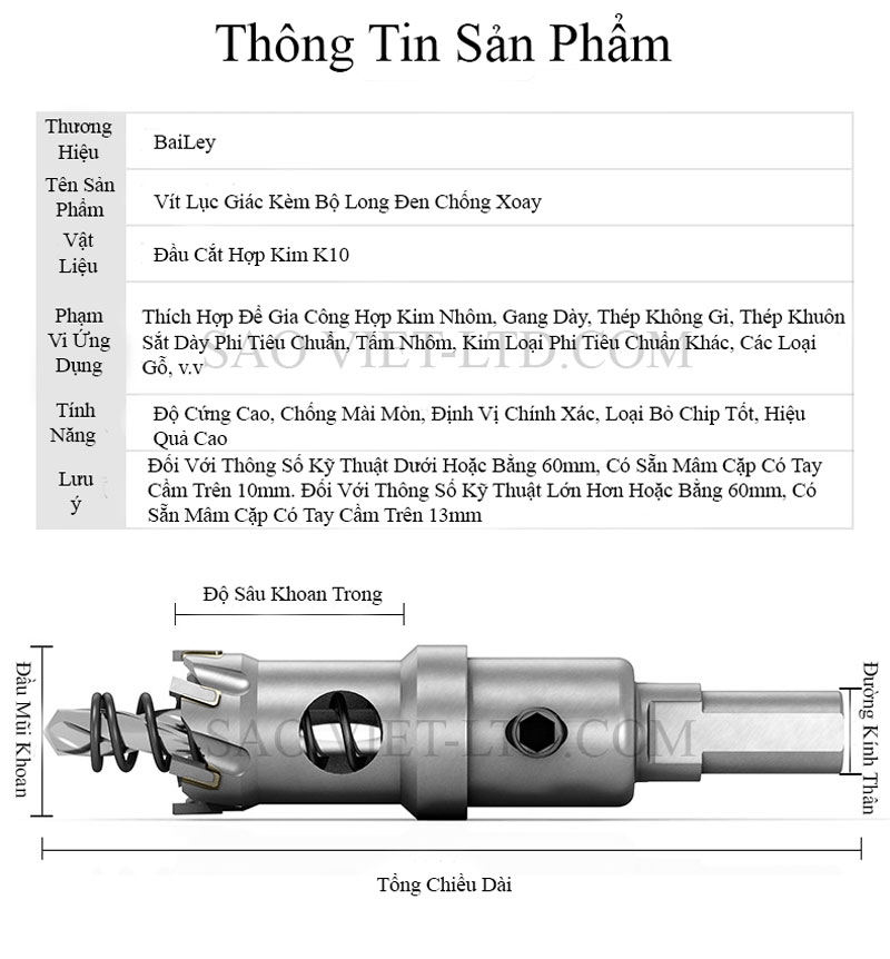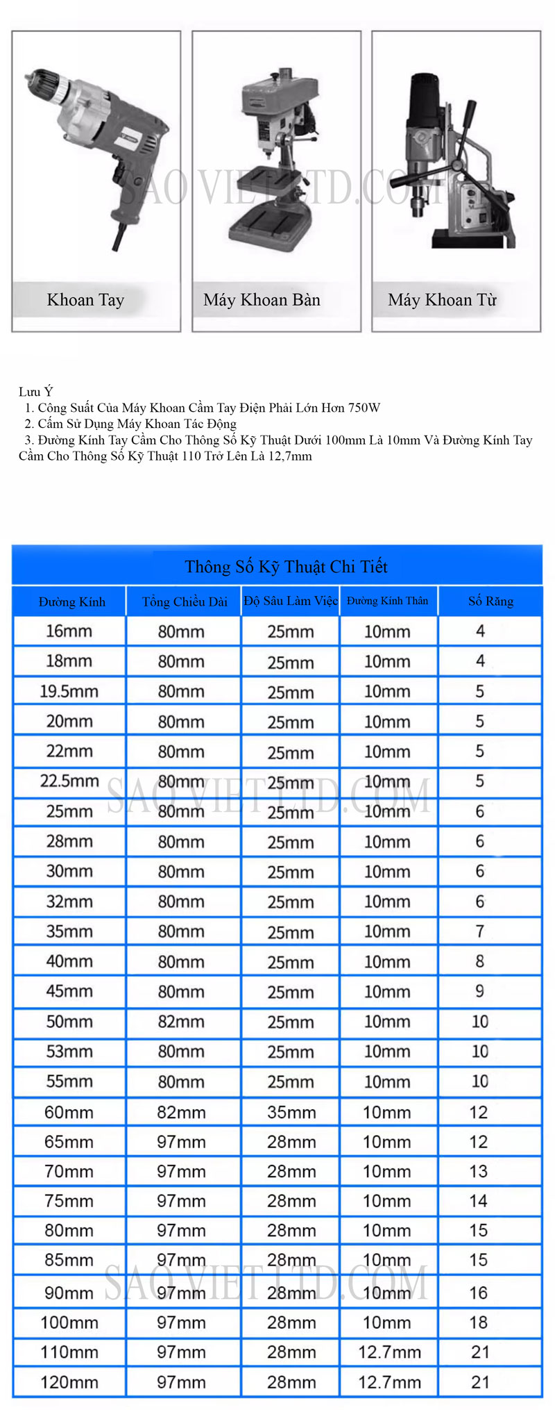 Vật liệu có thể khoét: Sắt thép, inox, đồng nhôm và các loại vật liệu kim loại khác