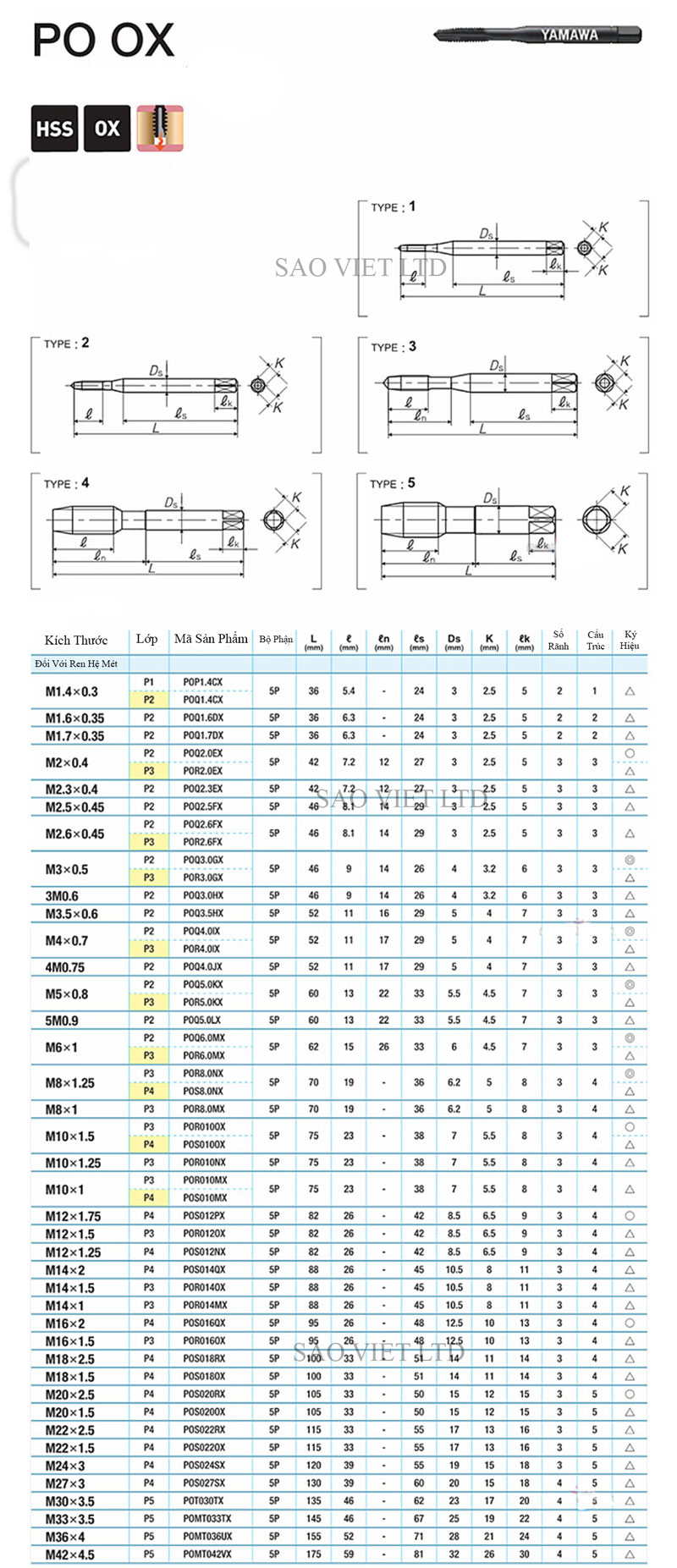 Bảng Thông Số Kỹ Thuật Mũi Taro Xoắn Inox Yamawa