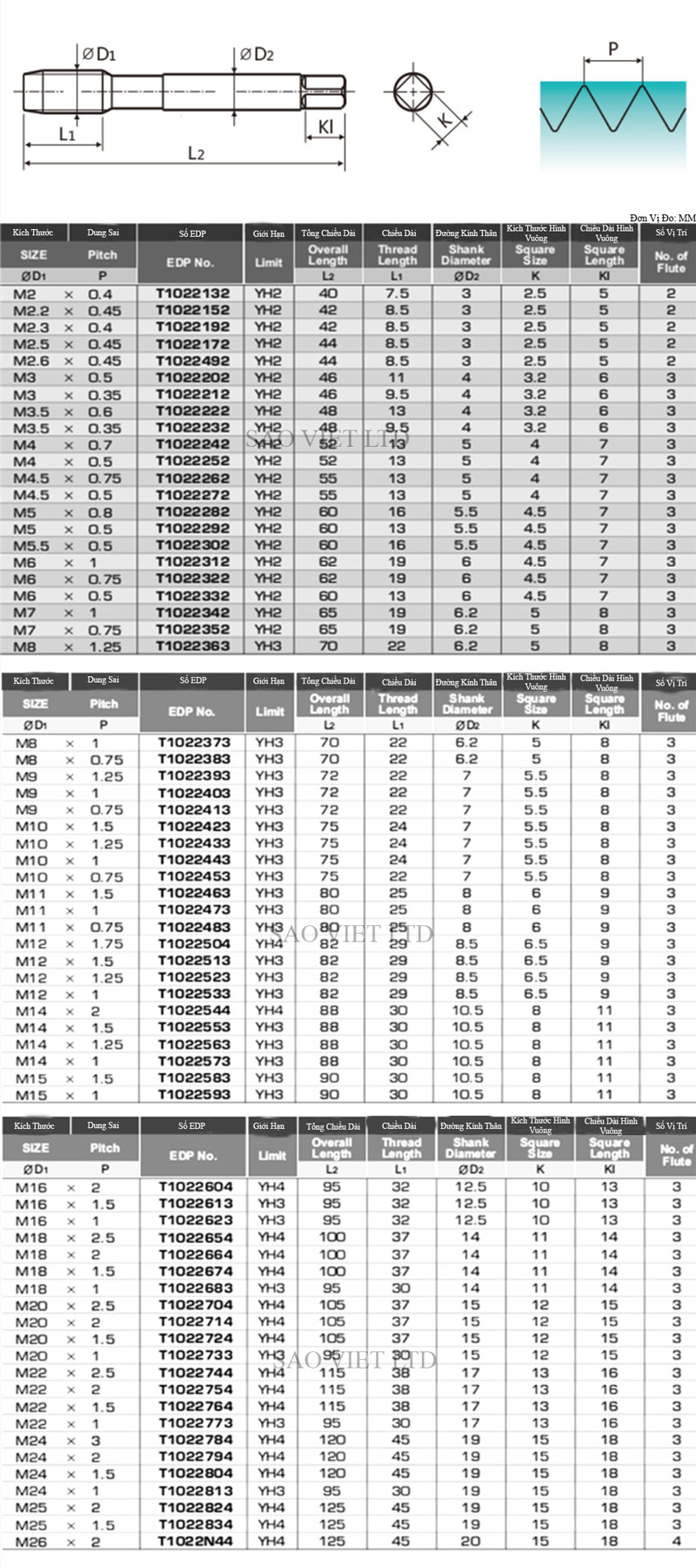 Bảng Thông Số Kỹ Thuật Mũi Taro Inox Xoắn YG