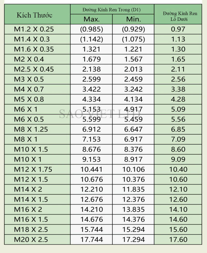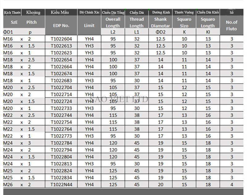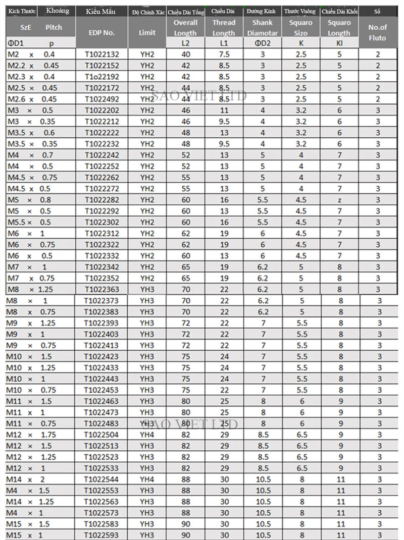 Bảng thông Số Kỹ Thuật Mũi Taro Xoắn Đa Năng Hàn Quốc YG