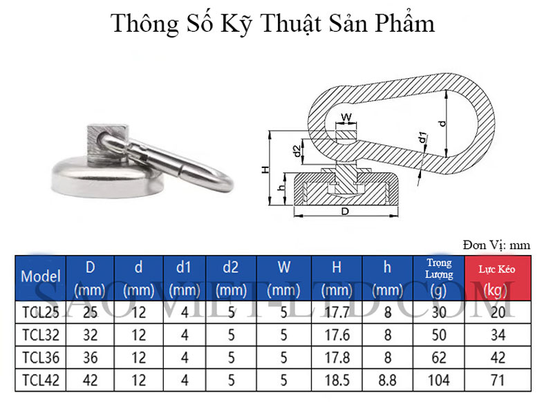 Đường kính đế nam châm: 25, 32, 36, 42.