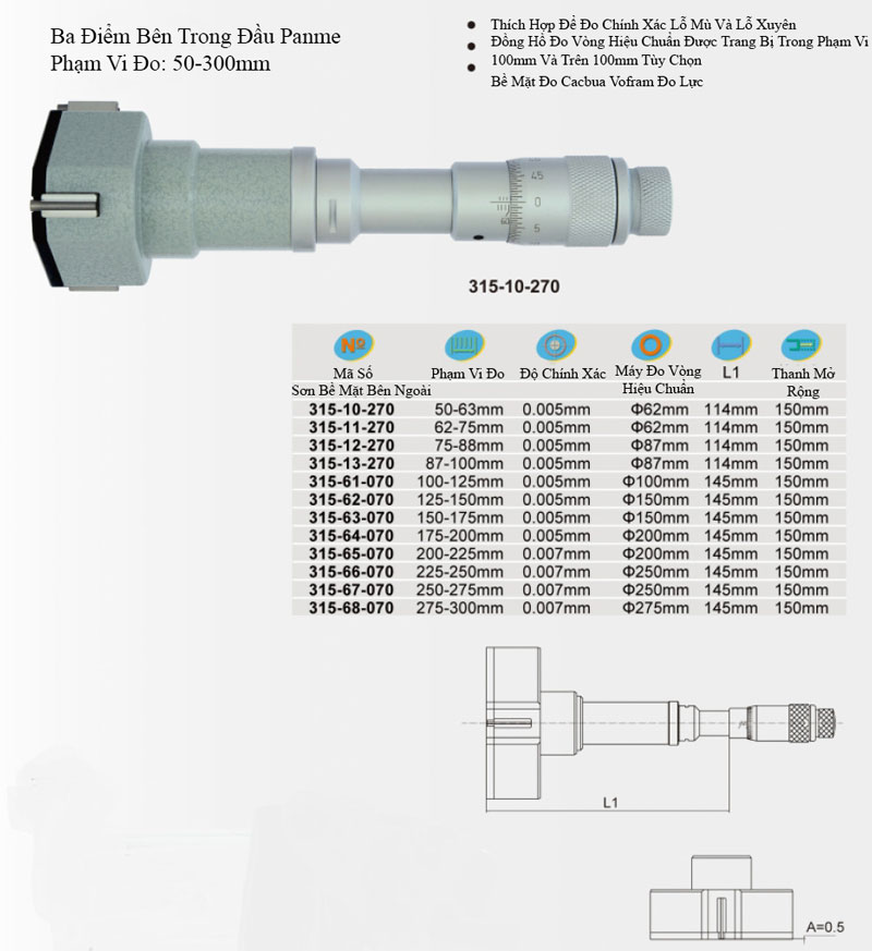 Panme đo lỗ 3 chấu kích thước lỗ 50-300mm