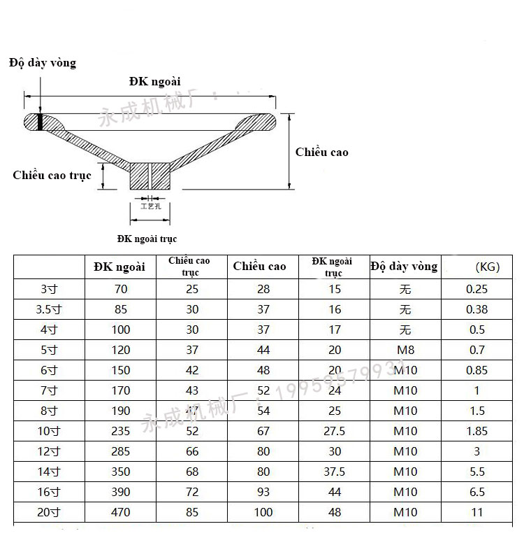 Lưu ý: Kích thước thực tế đường kính ngoài của tay quay sẽ theo bảng thông số