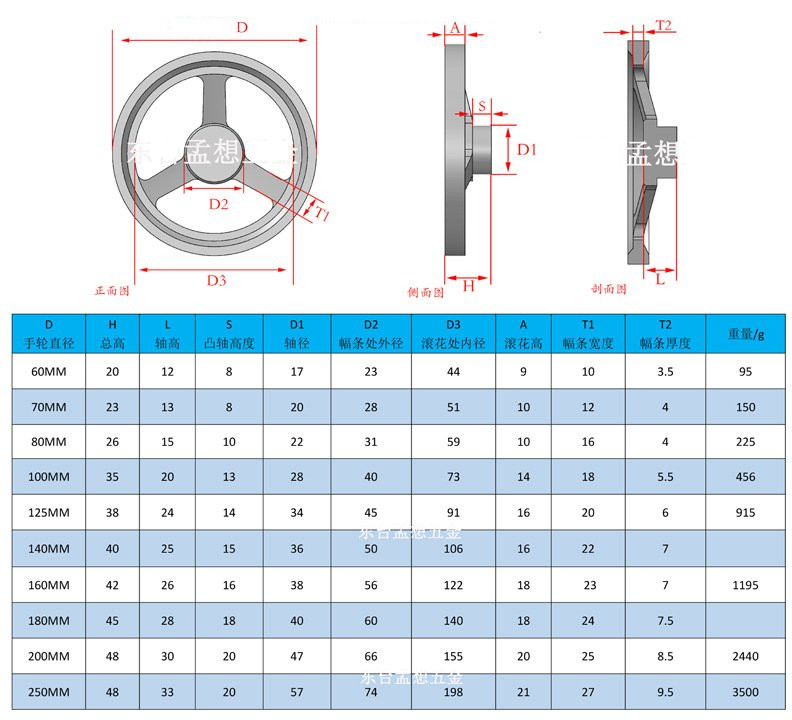 Kiểu tay quay không có tay cầm có khía cạnh nhám đường kính D60, D80, D100, D125, D150, D200, D250