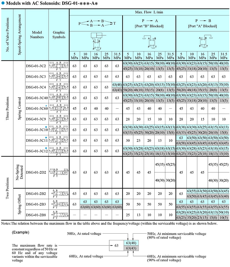 + Lưu lượng tối đa: Với loại van điện từ DSG-01-2B2, DSG-01-3C là 40 L/min, các loại còn lại như DSG-01-3C, DSG-01-2D2, DSG-01-2B là 63 L/min.