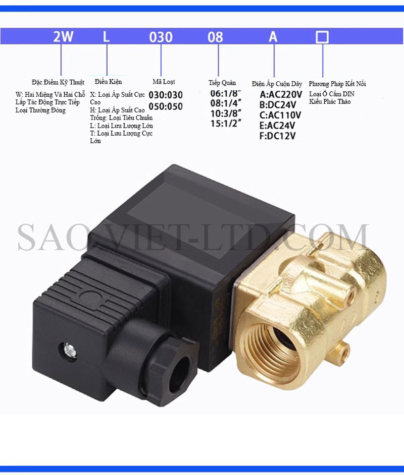 Van điện từ Airtac 2W030-08 là loại van điều khiển chất lỏng hoặc khí bằng điện từ, thuộc dòng van 2 ngã – thường đóng (NC), sử dụng điện áp DC 24V. Khi không có điện, van đóng chặn dòng chảy. Khi cấp điện, cuộn coil sinh từ trường hút lõi van lên, cho phép lưu chất đi qua.