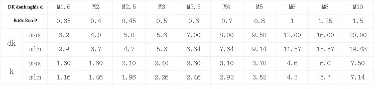 BẢNG THÔNG SỐ KỸ THUẬT VÍT INOX KIỂU ĐẦU TRÒN