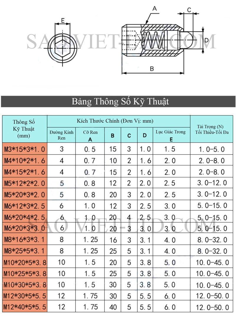 Bảng Thông Số Kỹ Thuật Vít Trí Lò Xo Pít Tông C-SPJZ