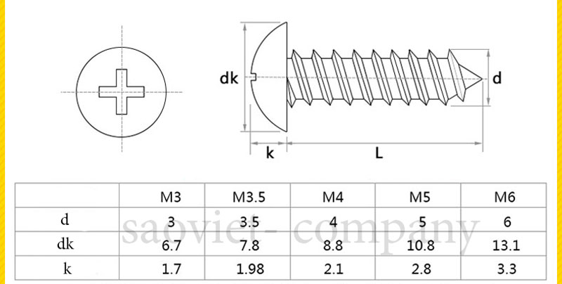 BẢNG THÔNG SỐ KỸ THUẬT VÍT TỰ KHOAN ĐẦU NẤM INOX