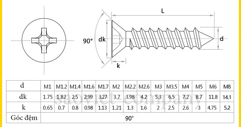 BẢNG THÔNG SỐ KỸ THUẬT VÍT TỰ KHOAN ĐẦU PHẲNG INOX