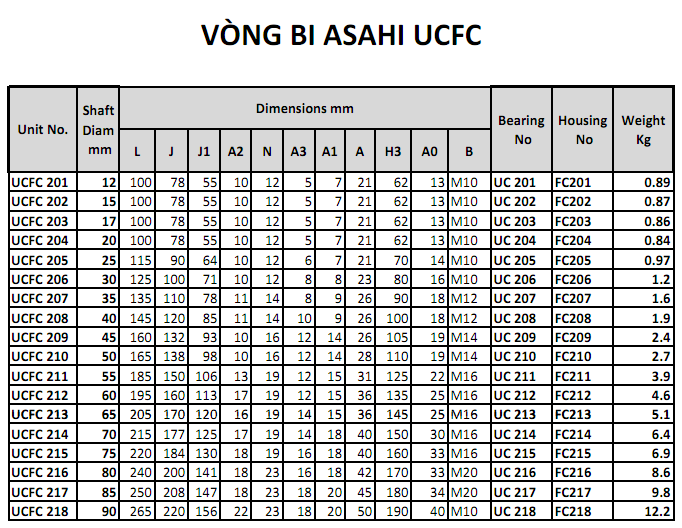 Gối đỡ ASAHI UCFC sử dụng vòng bi bên trong là UC thuộc dạng bi cầu 1 dãy bi. Bạc đạn này tương tự dòng bi 62xx và 63xx, có thể chịu tải hướng kính và một lượng tương đối tải hướng trục. Nhờ vành ngoài có dạng hình cầu bạc đạn UC có khả năng tự lựa. Điều này giúp vòng bi ASAHI UCFC thích ứng được với việc bị lệch trục hay chân đế xê dịch khi vận hành. ổ bi UC có 2 phớt chắn làm bằng thép và cao su kết hợp đem lại hiệu quả làm kín tốt nhất. Nhờ vậy vòng bi giữ được lượng mỡ bò giúp gối đỡ ASAHI UCFC có thể hoạt động trong môi trường ẩm ướt, có bụi bẩn. Vòng bi UC được tra sẵn mỡ bò chất lượng cao nên có thể vận hành ngay lập tức sau khi lắp, ngoài ra trên vỏ gối còn có gắn ốc mỡ để dễ cấp thêm chất bôi trơn. Việc cố định trục được thực hiện bằng cách bắt vít lên lỗ vít ở vòng trong bạc đạn UC.