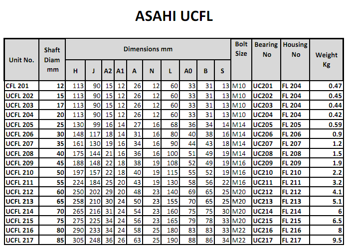 BẢNG THÔNG SỐ GỐI ĐỠ ASHAHI UCFL203, UCFL204, UCFL205, UCFL206, UCFL207, UCFL208