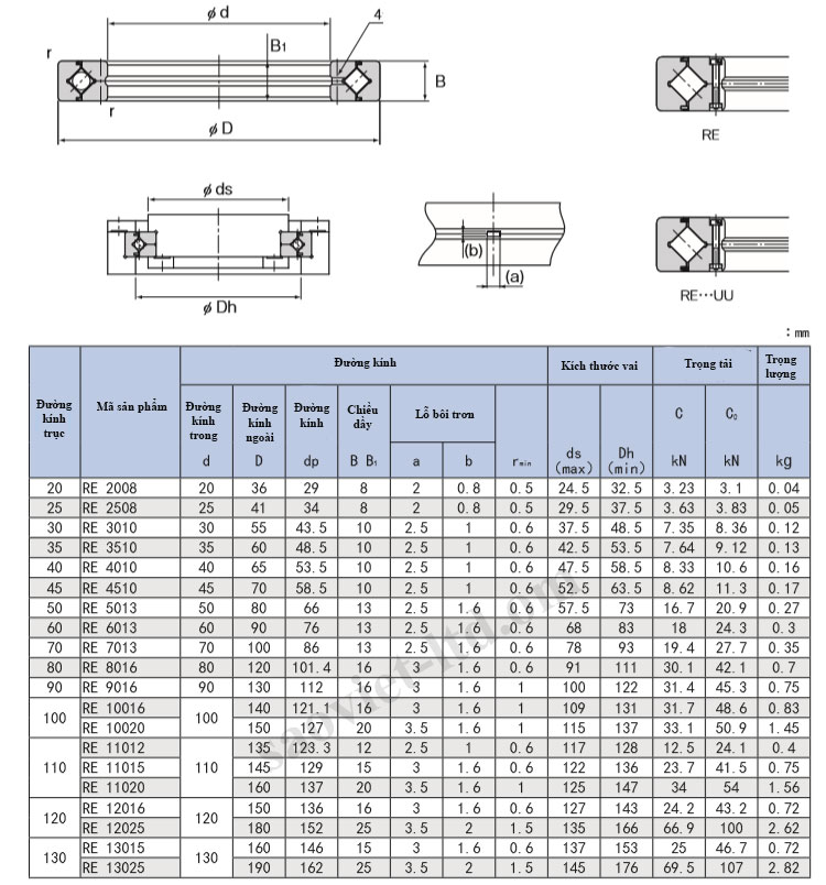 Mô hình sê-ri RE là loại mới được sản xuất theo khái niệm thiết kế của loại XRB và kích thước chính giống như loại XRB. Cấu trúc của nó là vòng trong là loại tách rời, và vòng ngoài là thiết kế một mảnh, phù hợp với các bộ phận đòi hỏi độ chính xác xoay cao của vòng ngoài.