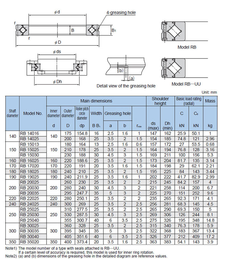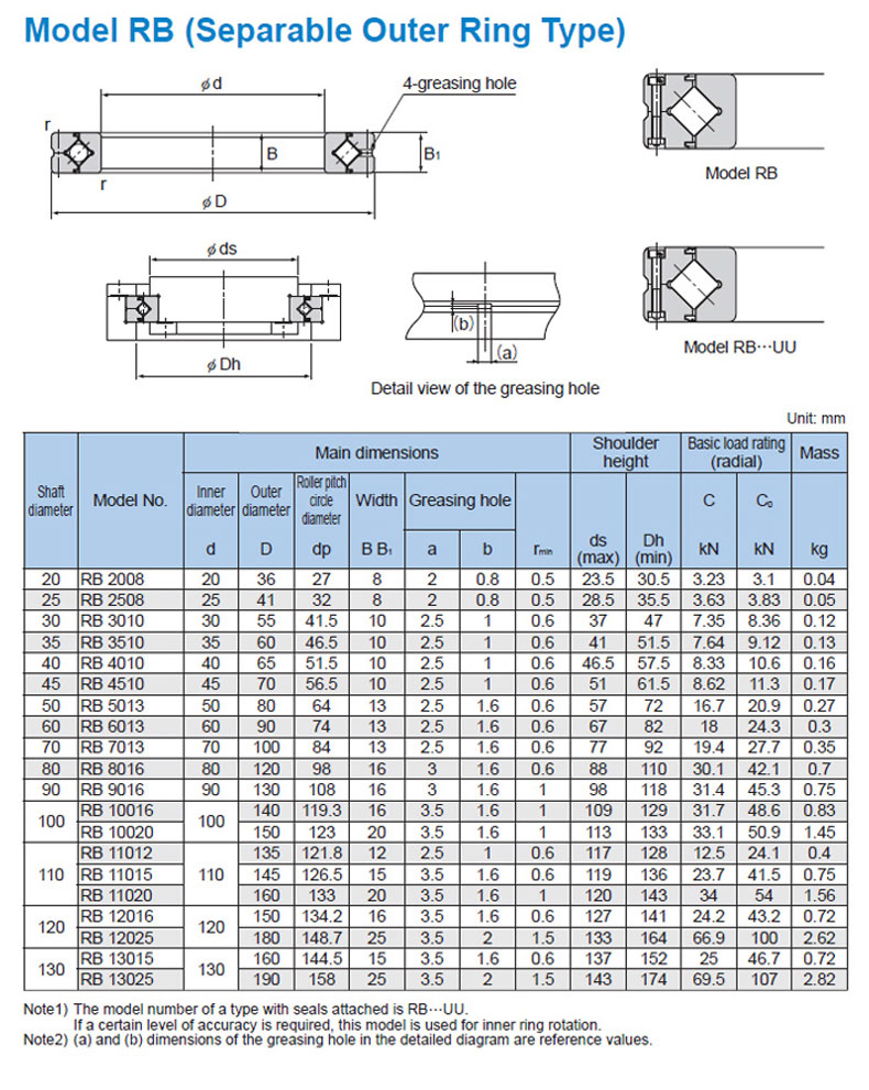 BẢNG THÔNG SỐ KỸ THUẬT VÒNG BI MÂM XOAY THK KIỂU RB