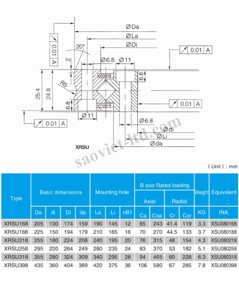 - Vòng bi mâm xoay RA là loại nhỏ gọn giúp giảm độ dày của vòng RB bên trong và vòng ngoài đến giới hạn. Thích hợp cho các bộ phận yêu cầu trọng lượng nhẹ và thiết kế nhỏ gọn, chẳng hạn như các bộ phận quay robot và thao tác.