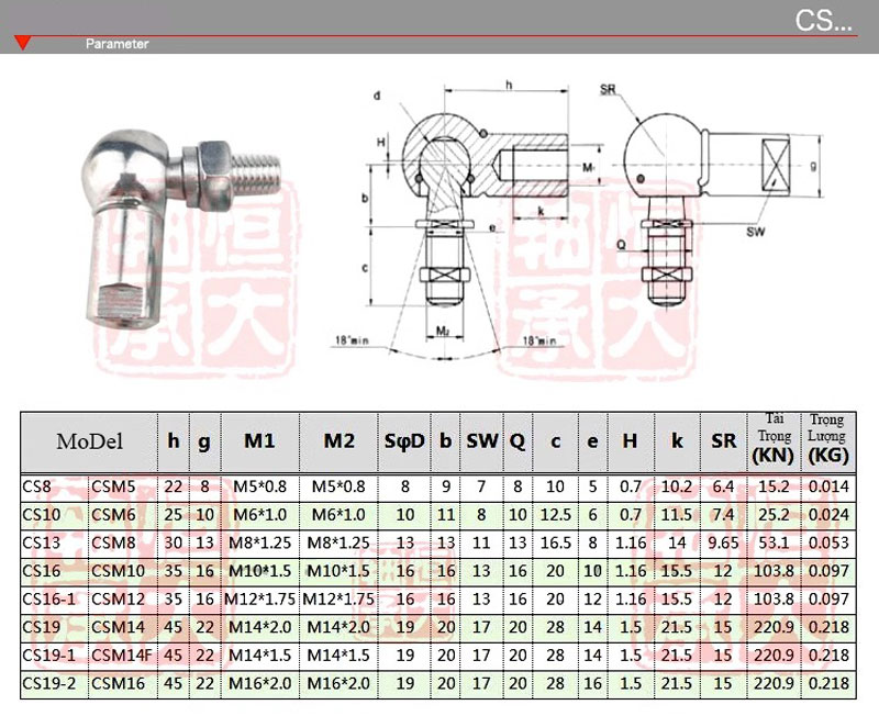 Bảng Thông Số Kỹ Thuật Vòng bi mắt trâu Inox CS