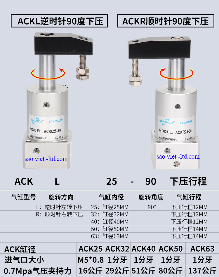 Model: ACK25, ACK32, ACK40, ACK50, ACK63 - (L Kiểu xoay Trái, R - Kiểu xoay phải)