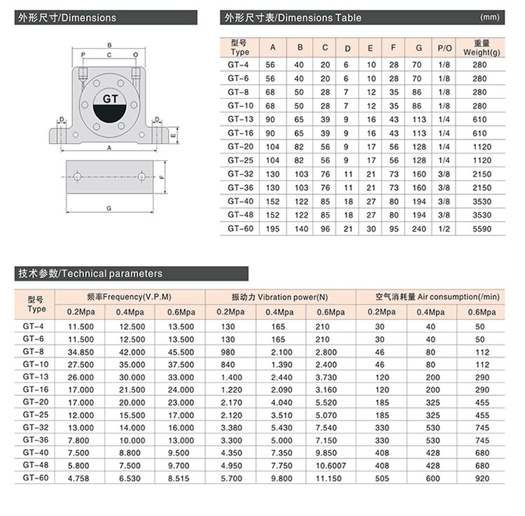 Thông số kỹ thuật bộ rung khí nén GT